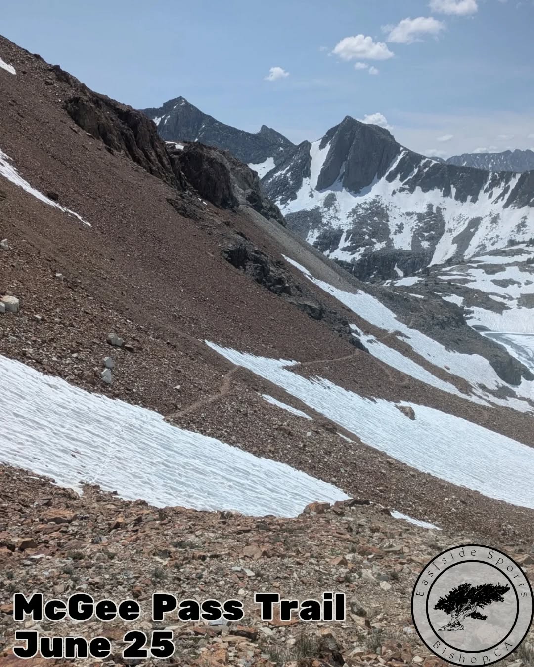 Local adventurer @nattydil shares the latest conditions from a Sierra High Route section near McGee Pass. Expect snow patches, firm avalanche debris, and icy side slopes—ice axe and foot traction strongly recommended! Final switchbacks are nearly clear with scramble-able workarounds.