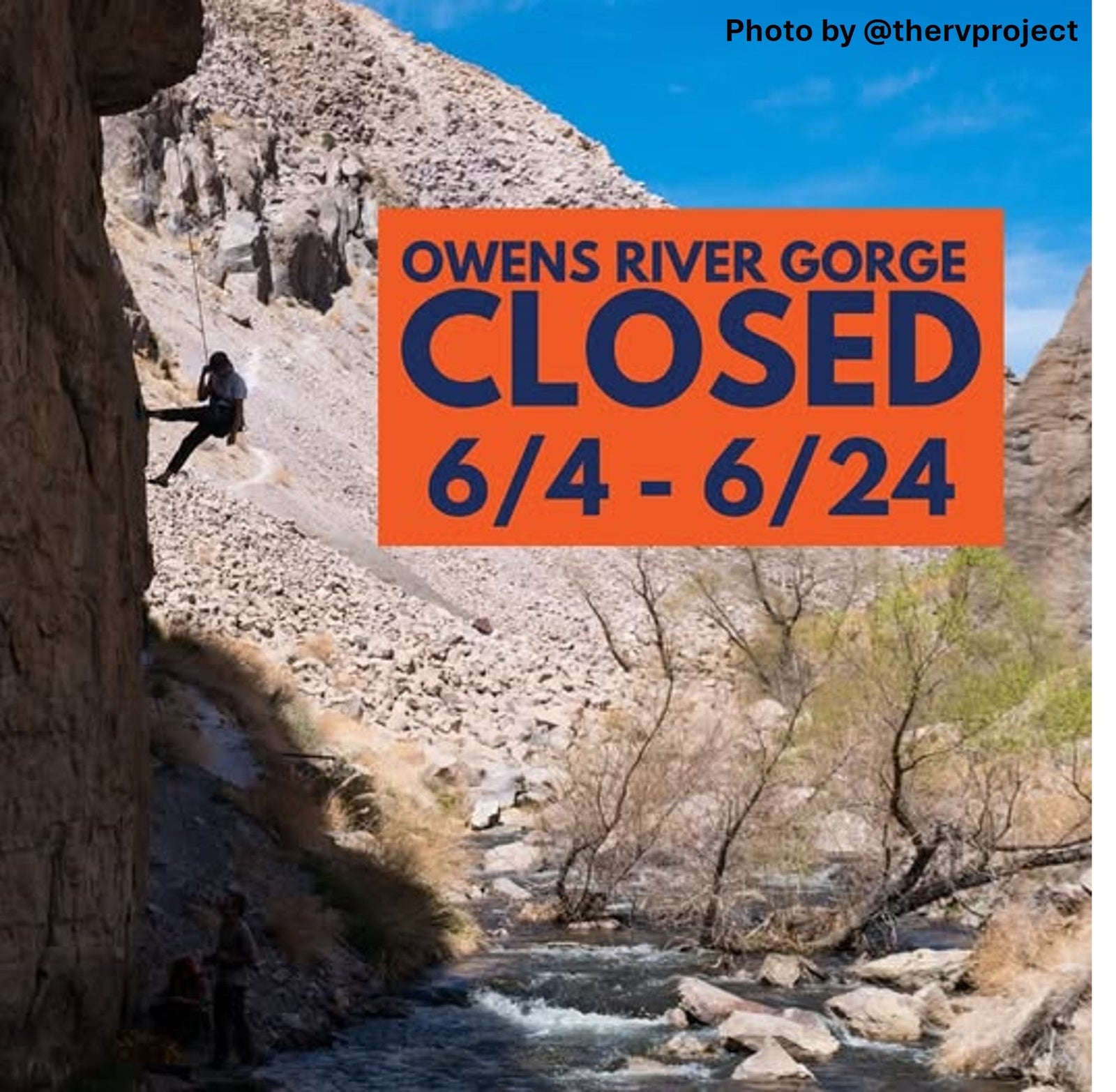 Heads up, climbers! From June 04–24, 2025, the Owens River Gorge will be closed to public access due to high water releases by LADWP, in partnership with CA Fish & Wildlife and Mono County.