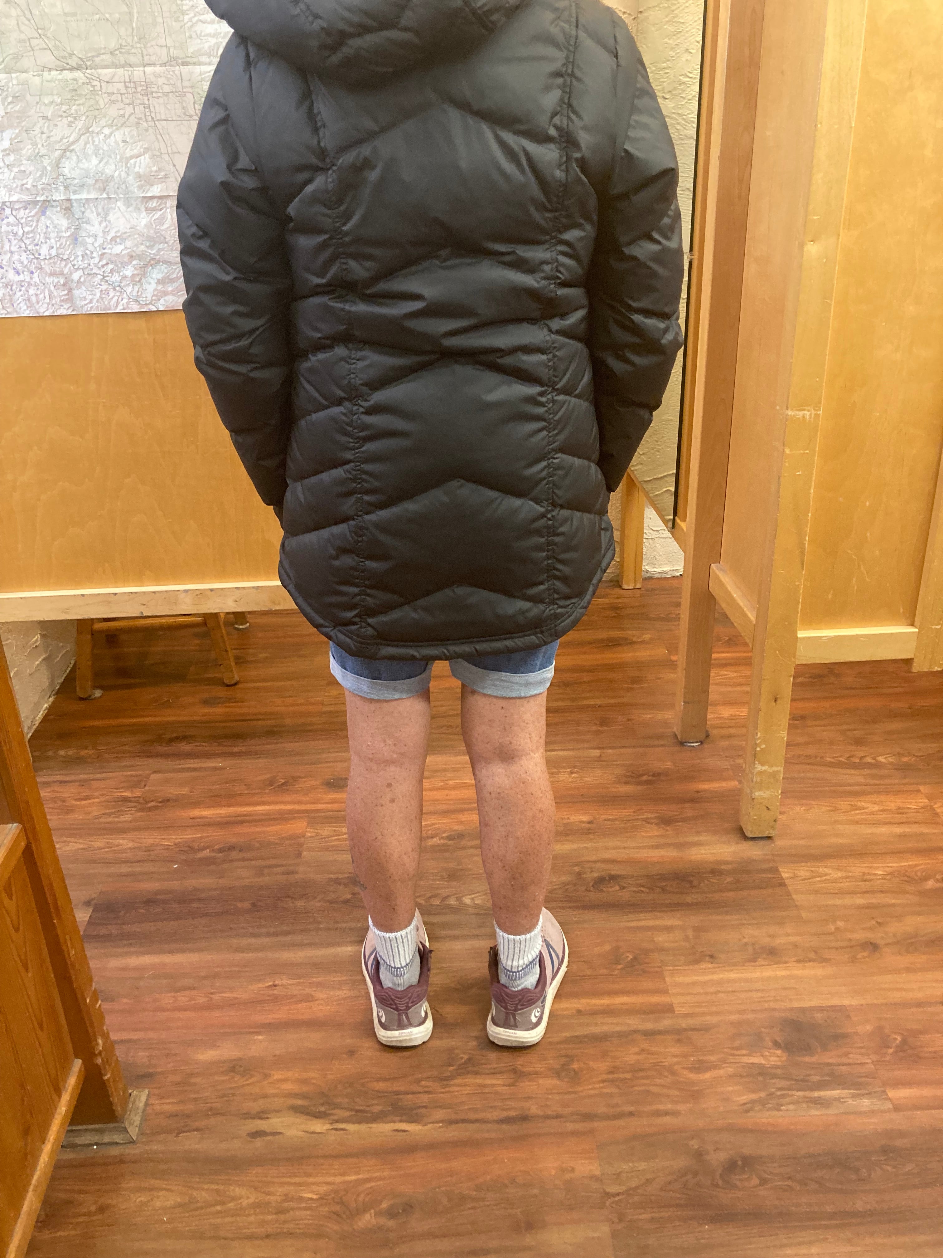 Please note - this jacket is not quite parka length, but it does come down to the thigh on most people. See attached photos for reference. Sabine (black shorts) is 5'11" and wearing a size S. Tess (red pants) is 5'5" and wearing a size M. Shelley (jean shorts) is 5'2" and wearing a size M.